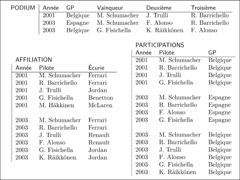 @let PODIUM = @relation [Annee, GP, Vainqueur, Deuxieme, Troisieme] {