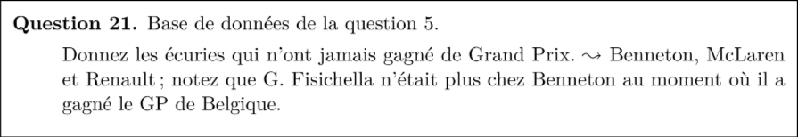 @let HasWon = @project{Ecurie} (@rename{Vainqueur:Pilote}( @project{Annee, Vainqueur}(PODIUM)) @join AFFILIATION)