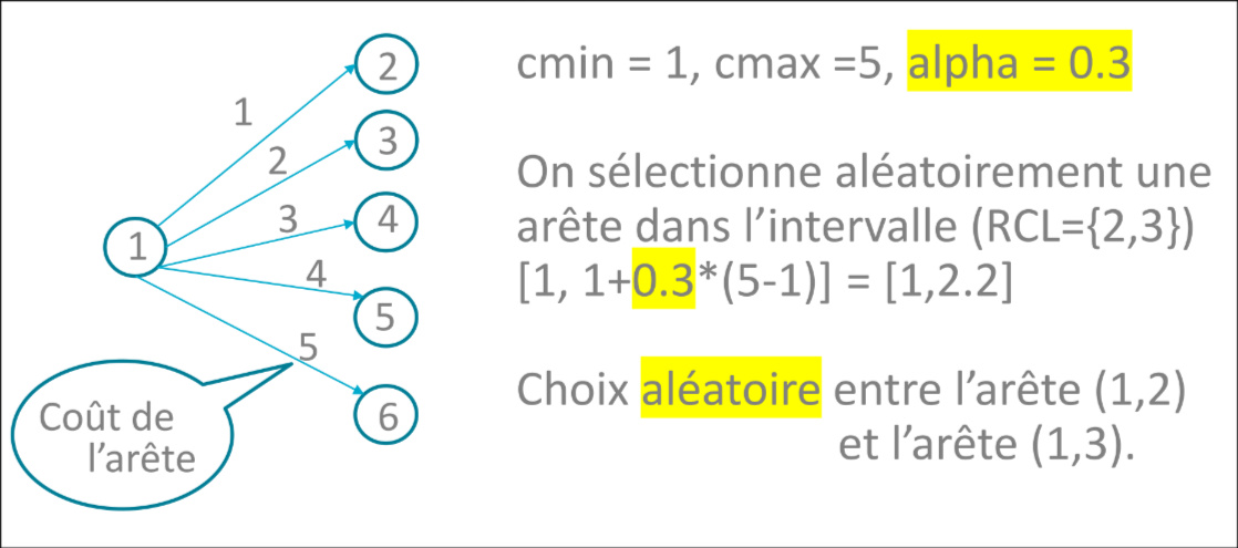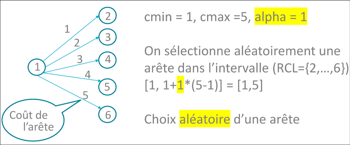 On va construire des solutions de manière gloutonne, mais en randomisant la décision. C’est-à-dire que comme les autres algorithmes locaux on va choisir la meilleur décision sur l’instant t. Cependant, on a un probabilité de prendre une solutions qui n’est pas optimale au moment t. Lorsque que l’on tombera dans un cas aléatoire, on va choisir une des valeurs aléatoirement.